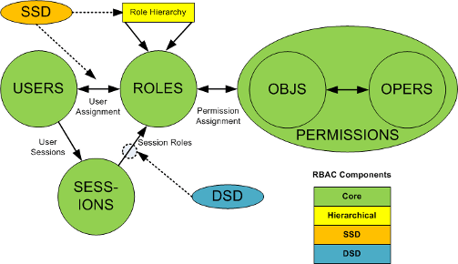 To be considered RBAC compliant an access management system, at a minimum, supports the following entities: Users, Roles, Permissions (mapping between objects and operations) and, most important – Sessions.