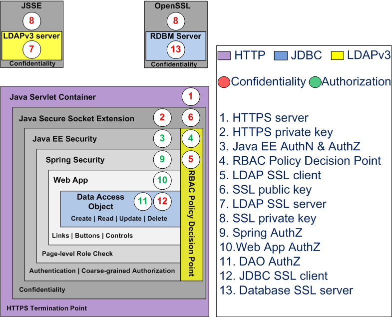 Requirements covered include authentication, authorization and confidentiality. Both declarative and programmatic enforcement controls will be used. Authorization granularity ranges from coarse (java EE, spring) to fine (fortress).